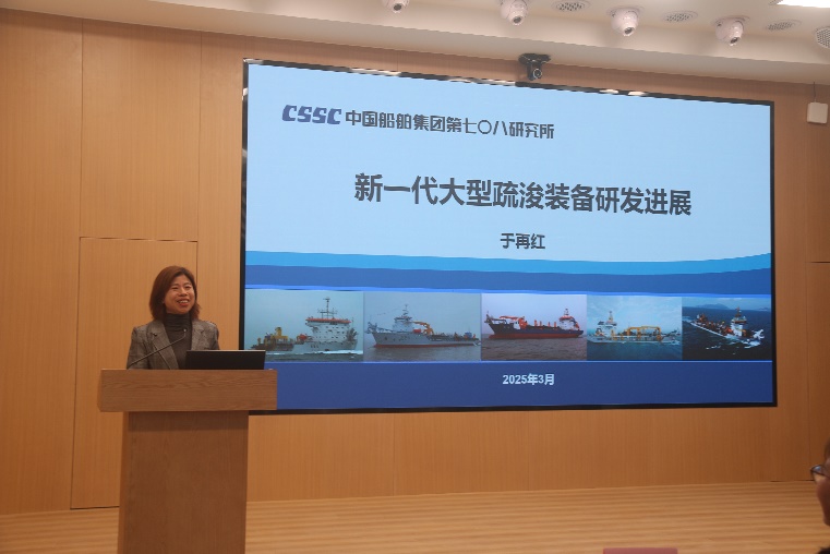 讲座中,于再红首先对中国船舶集团及第七〇八研究所进行了介绍,接着以代表性的船型如"新海虎"耙吸挖泥船、"天鲲号"绞吸挖泥船等为例,详细阐述了中国疏浚装备的发展历程。她点明,疏浚工程作为基础性建设工程,意义重大,挖泥船作为清淤治理、航道维护、港口建设、填海造陆的关键装备,地位不可小觑。七〇八所长期投身国内疏浚装备研发,打造出多款具有"里程碑"意义的产品。她一边回忆研发过程中遇到的困难挑战,一边为同学们科普先进疏浚技术,她鼓励同学们努力学习、勇于创新,积极投身船舶与海洋工程领域,助力海洋强国建设。